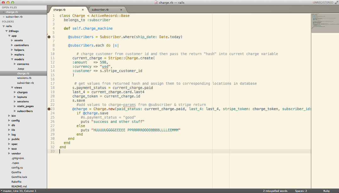 -I first spent time taking a look at a few different payment processors documentation to figure out which one was the simplest to use and worked for our project. It came down to cheddergetter.com and stripe.com in which we chose Stripe for its simplicity. I read over the documentation, signed up for a test api key, and used Pry to make api calls to Stripe creating customer tokens, charge tokens, and new subscriptions. Joseph and I got Stripe up and running on the website and worked together to understand how Stripe uses our forms and creates tokens.